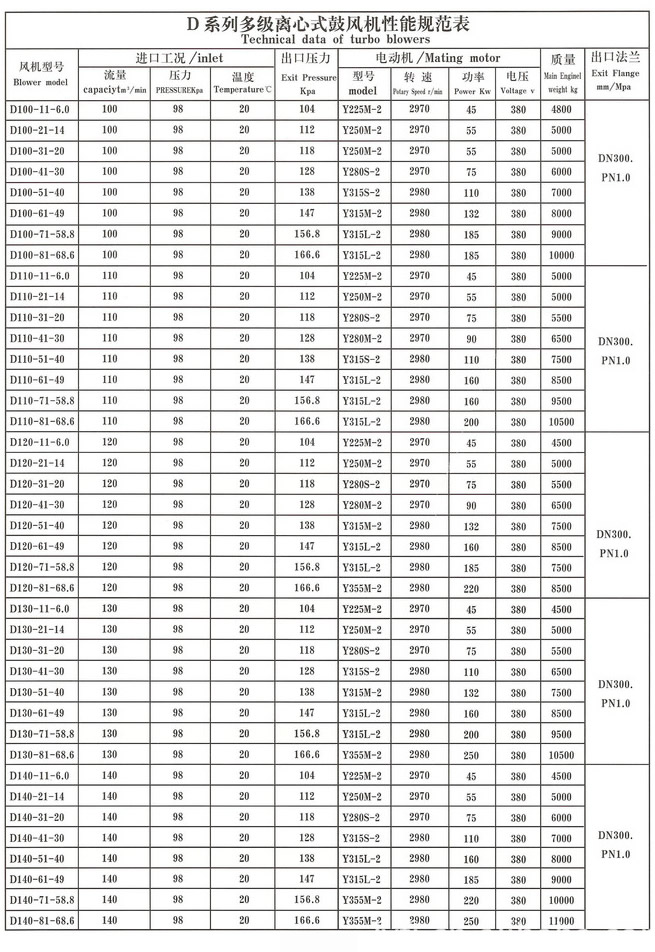 D系列多级离心式鼓风机性能规范表