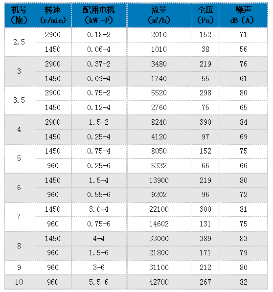 轴流式T40风机按叶轮直径可分成10种型号,依次排列为2.5#、3#、3.5#、4#、5#、6#、7#、8#、9#、10#等。每种机号叶片又可安装成15°、20°、25°、30°、35°等五种角度。本系列产品均采用叶轮直接装在电动机轴上的直联结构,也可根据用户要求做成皮带传动KT40系列轴流风机。在叶轮圆周速度不超过60m/s条件下配用3种转速:2900,1450,960r/min。面对进风口方向看叶轮为逆时针转动.